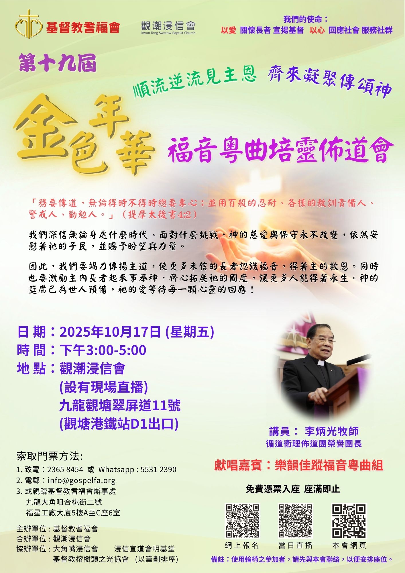 我們深信無論身處什麼時代、面對什麼挑戰,神的慈愛與保守永不改變,依然安慰著祂的子民,並賜予盼望與力量。因此,我們要竭力傳揚主道,使更多未信的長者認識福音,得著主的救恩。同時也要激勵主內長者起來事奉神,齊心拓展祂的國度,讓更多人能得著永生。神的筵席已為世人預備,祂的愛等待每一顆心靈的回應!
