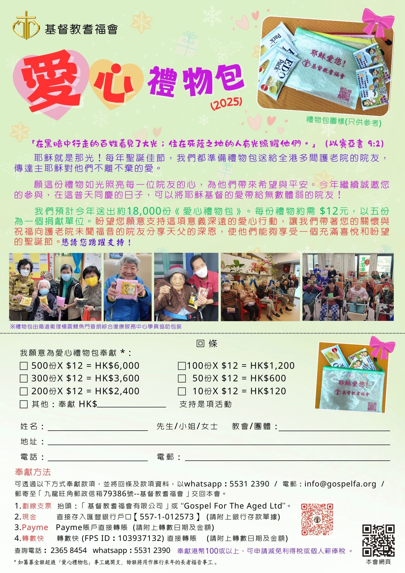 我們預計今年送出約18,000個《愛心禮物包》。每份約需 $12元,以五份為一個捐獻單位。盼望您願意支持這項意義深遠的愛心行動,讓我們帶著您的關懷與祝福,與護老院未聞福音的院友分享天父的深恩厚愛,使他們能夠享受一個充滿喜悅和盼望的聖誕節。懇請您踴躍支持!